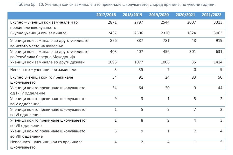 - Нешто помалку од половина од вкупниот број ученици го напуштиле основното училиште заради емиграција во странство. Овој процент, со исклучок на пандемиската 2019/2020 година, забележува благ пораст низ годините под анализа. Дополнително, се зголемува и процентот на ученици кои го напуштиле основното училиште заради внатрешни миграции – се појаснува во анализата.