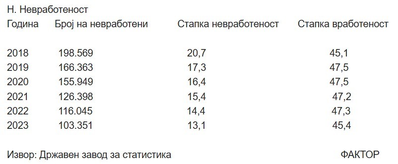 Ако ги погледнеме стапките на вработеност и невработеност во изминативе пет години ќе забележие големи разлики. Па така во 2018 година стапката на невработеност била 20,7 отсто, за да се намали на 17,3 проценти во 2019 година, па на 16,4 отсто во 2020 година. Трендот на намалувње продолжува и следните години и во 2023 година спаднала на 13,1 процент.
