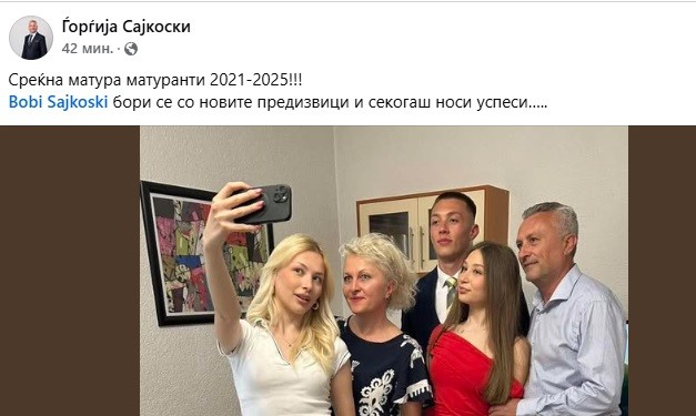 Ѓорѓија Сајковски од ВМРО-ДПМНЕ на социјалните мрежи објави дека неговиот син е матурант и му посака успех во иднина и борба со новите предизвици.