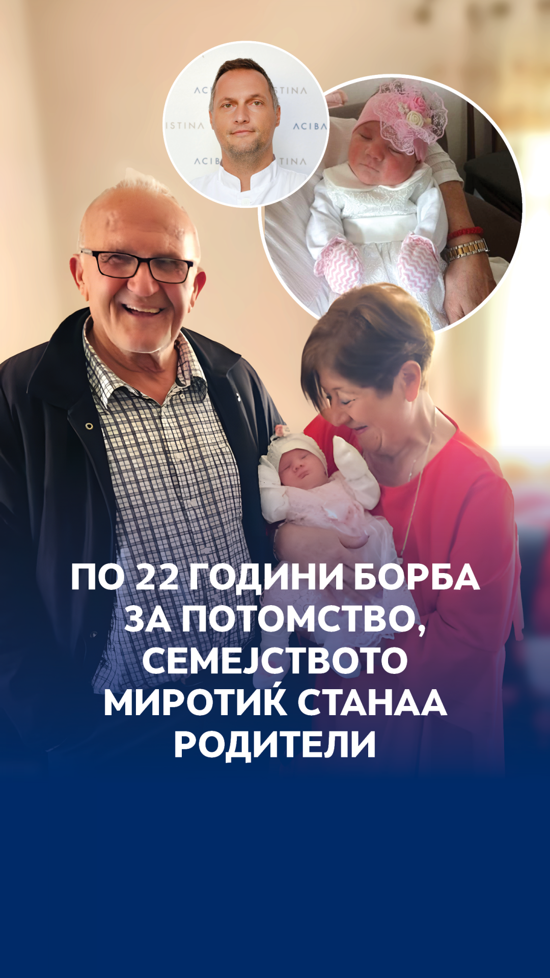 По 22 години борба за потомство и осум спонтани абортуси, Соња и Марко Миротиќ од Црна Гора денес во прегратки ја имаат двомесечната ќерка Богдана. Сонот на 57 годишната Соња да стане мајка стана реалност благодарение на Центарот за ИВФ на Клиничката болница „Аџибадем Систина“.