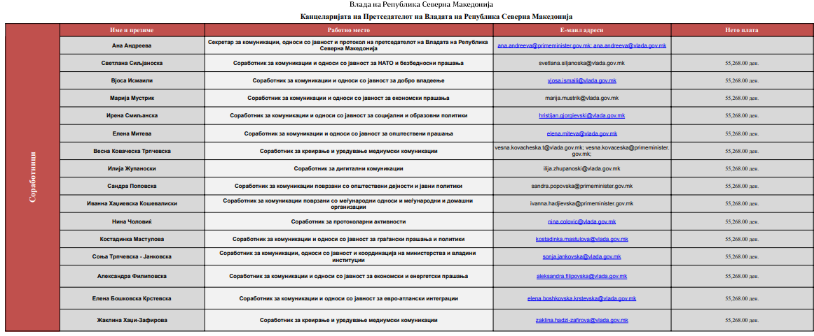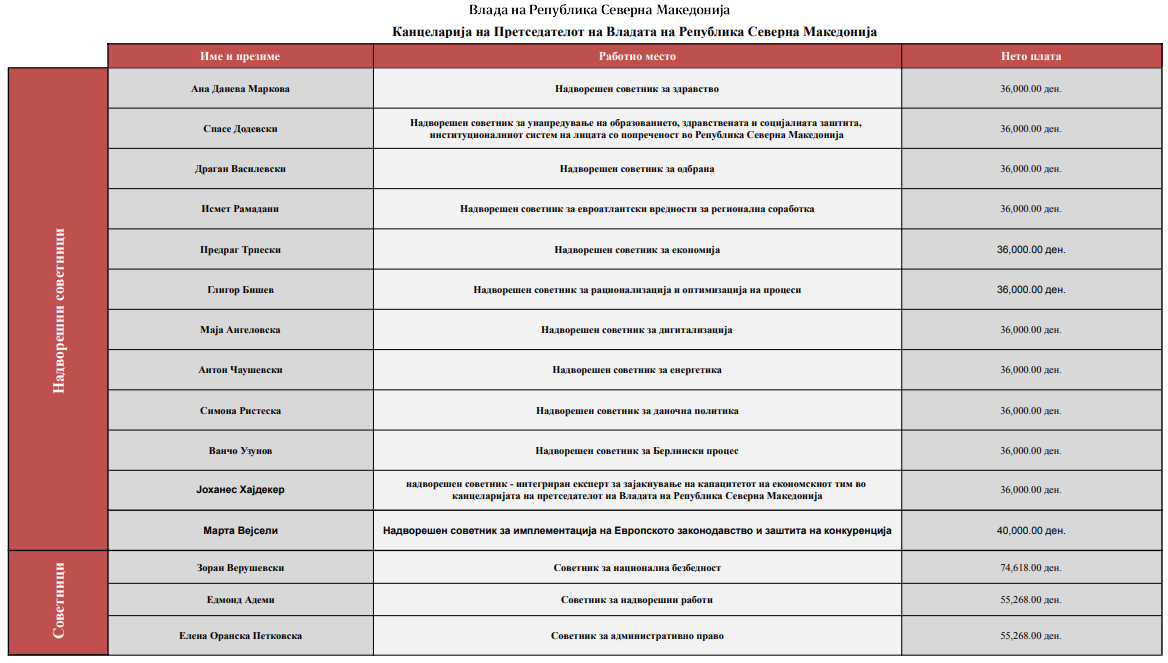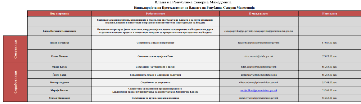 Објавени се платите и имињата на уште околу 25 соработници и советници кои влегуваат во списоците во трите потсекретаријати.