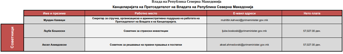 Љубе Бошковски и Аксел Ахмедовски и натаму се советници и дури и платите им се зголемени за околу 2.000 денари. Поранешните советници во кабинетот на Заев - Виктор Андонов и Милан Живковиќ, сега се соработници, додека кај секторот за комуникации може да се прочитаат 15-тина главно поранешни новинари.