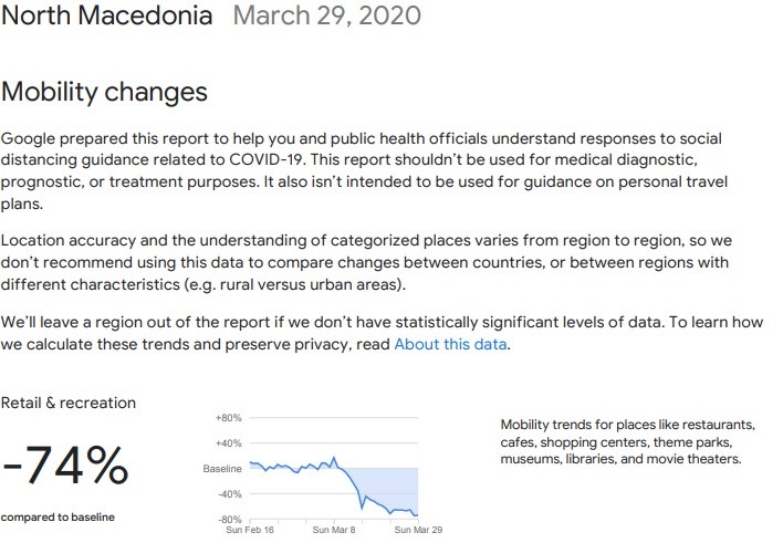 Гугл подготви извештај за да им помогне на службените лица во јавното здравство да ги разберат насоките на социјалната дистанца поврзана со COVID-19. Овој извештај не треба да се користи за медицинска дијагностика, прогноза или цели за третман. Ова исто така не е наменето да се користи како насока за планови за лични патувања.