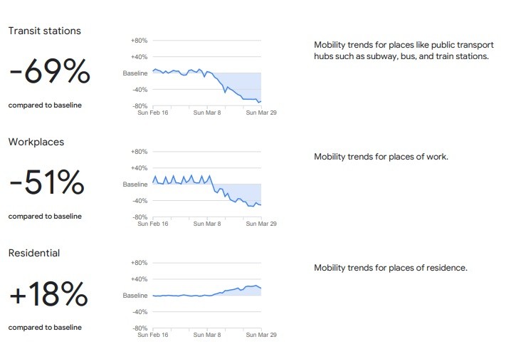 За места како јавен превоз, центри како што се метрото, автобусот и железничките станици, падот е 69 отсто.