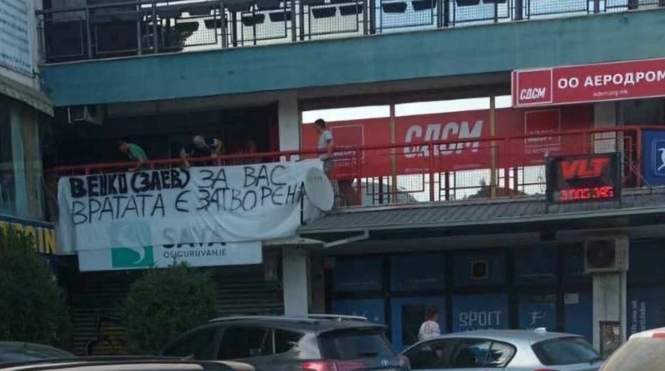 „Венко (Заев) за вас вратата е затворена“, пишува на транспарентот за кој нема информации од кого е поставен.