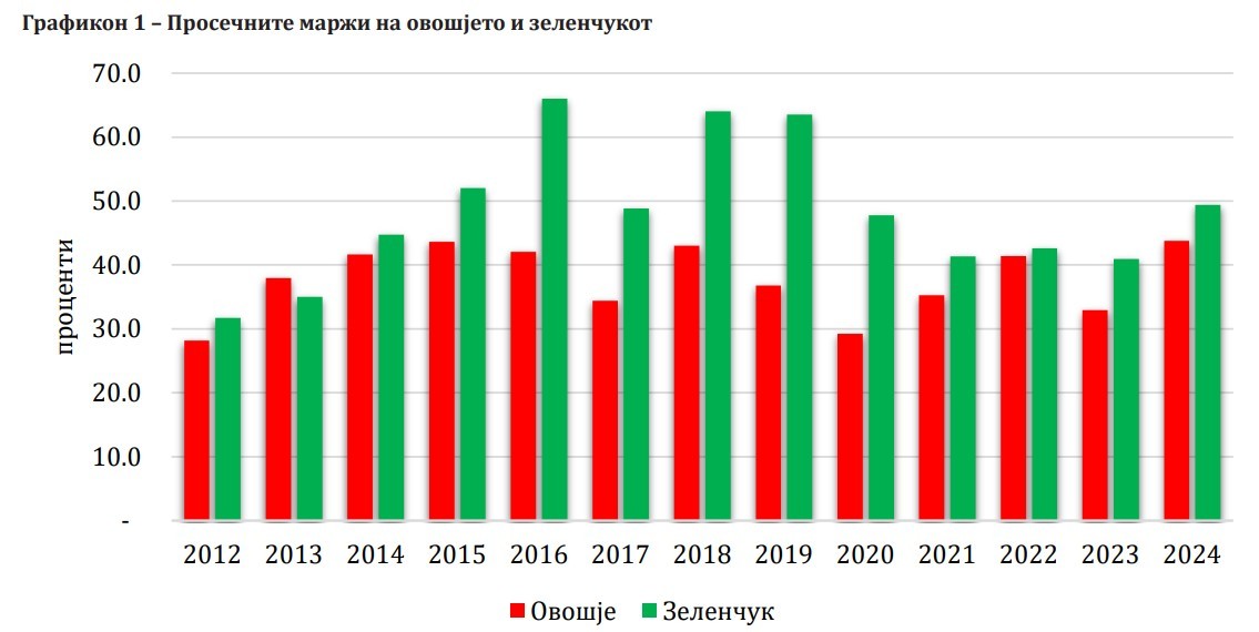Просечната малопродажна маржа кај овошјето достигнувала 37,7 отсто, додека кај зеленчукот 48,3 проценти, утврдила анализата на Институтот за економски истражувања и политики „Фајненс тинк“. Тие извршиле анализа на маржите на продуктите за изминатите десетина години и утврдиле дека маржите повеќе се зголемувале до 2017-2018 година, по што следува период на стагнација на маржата.