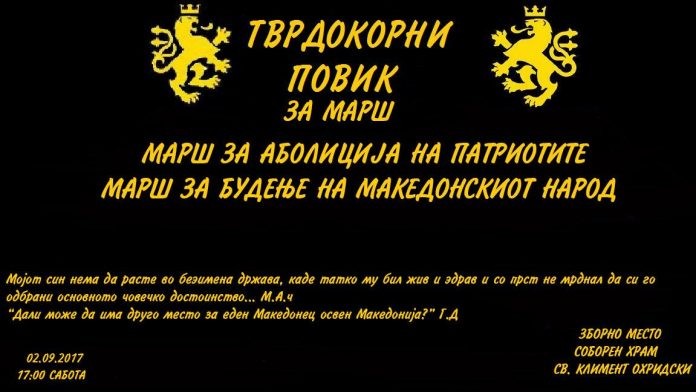 Тврдокорните ќе организираат марш кој ќе се одржи на 2 септември, со почеток во 17 часот под мотото „Марш за аболиција на патриотите – Марш за будење на македонскиот народ”.
