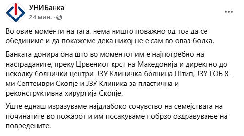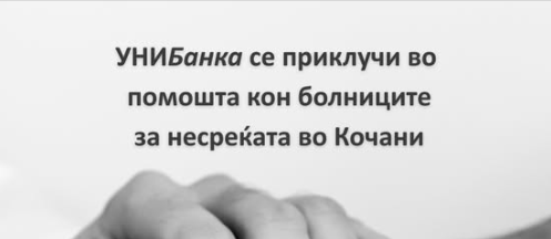 Трагедијата во Кочани, ја потресе целата македонска јавност. Тоа наметнува потреба од единство, солидарност и несебична помош од секого. Помошта е неопходна и од компаниите во нашата земја, кои треба да покажат сочувство и да дадат поддршка, брзо и во нешта кои се навистина потребни. Позитивен пример за сите е УНИБанка која даде помош во болнички материјали за повеќе болници низ земјава. Оригиналната порака ја пренесуваме од фејсбук постот на оваа општетсвено одговорна институција....се надеваме сите ќе го следат овој пример.
