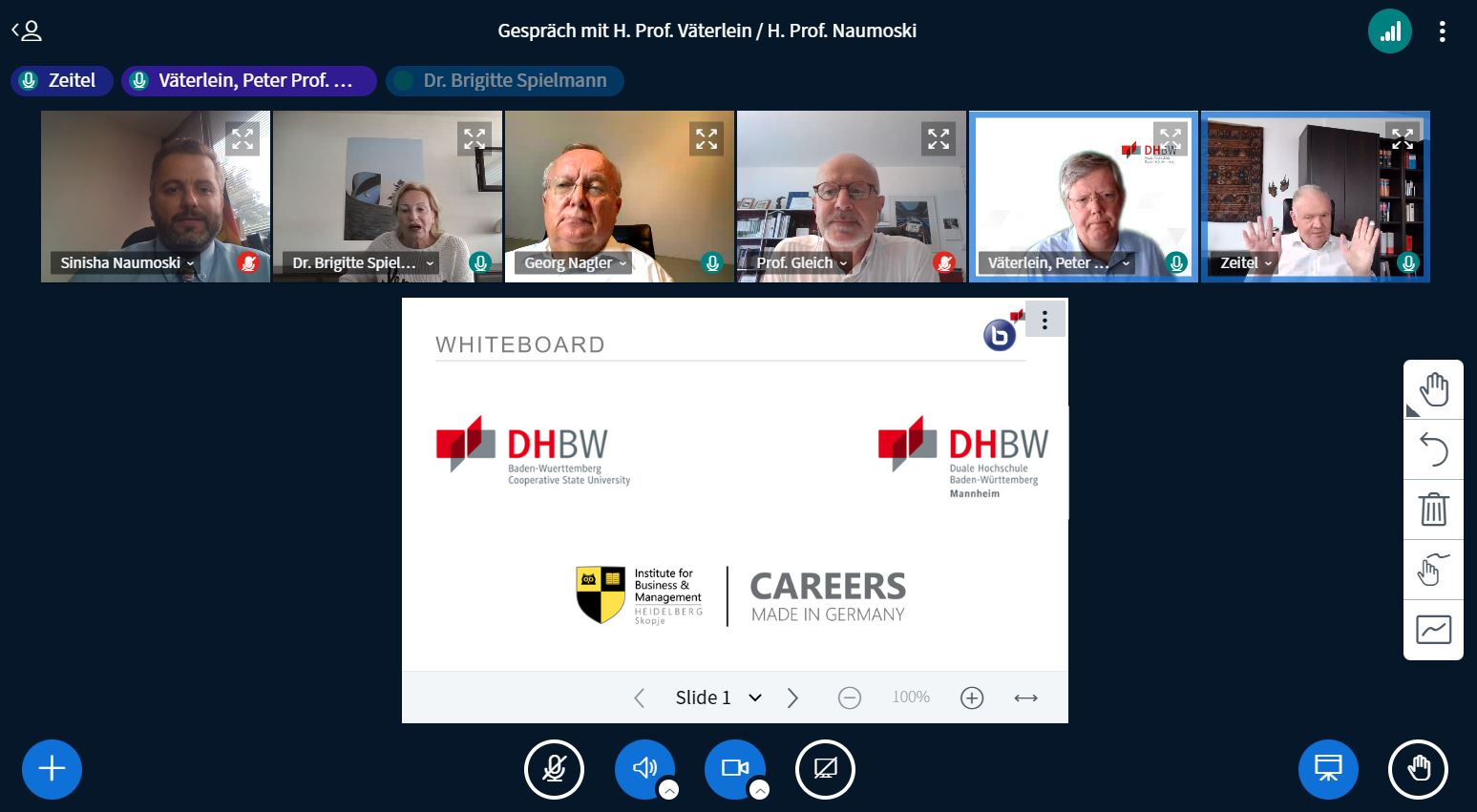 Целта на состанокот беше виртуелно „здружување“ или кооптирање на IBMHS и DHBW, каде се разговараше за сите релевантни прашања во врска со влезот на дуалните студии на DHBW Манхајм на платформата на германскиот институт ХАЈДЕЛБЕРГ во Скопје (или т.н. проект „Германија дома“).