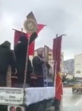 На камионот во Велес можат да се забележат повеќе закачени знамиња, меѓу кои државното знаме, знамето од Вергина, а на него се наоѓаат и црковни знамиња.