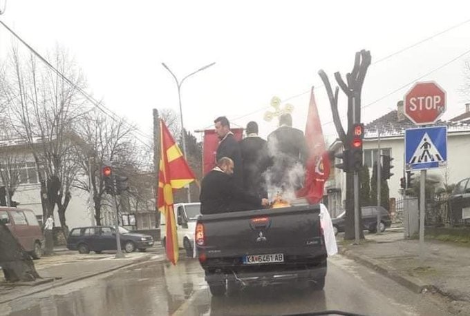 На Твитер се шират видеа и фотографии од Велес, но и од Кавадарци, на кои се гледа како неколку попа од Македонската православна црква, едните качени на камион, другите на пикап, се возат низ Велес и Кавадарци, пеат песни и чадат со темјан.