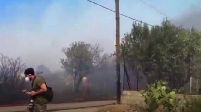 Пожарот минува низ ниски грмушки и маслинови дрвја во ретко населената област во близина на Вари, околу 30 километри јужно од центарот на Атина.
