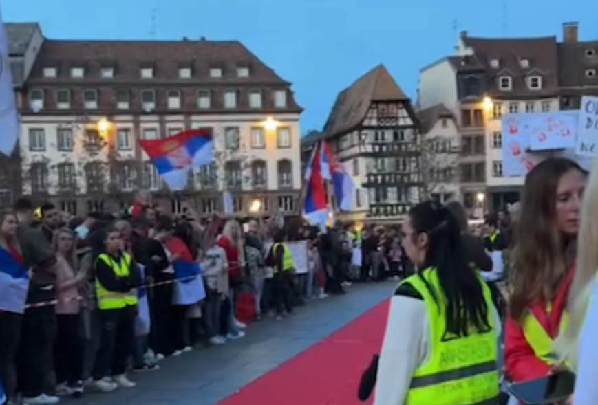 Стотици луѓе попладнево се собраа на плоштадот „Клебер“ во Стразбур за да ги пречекаат српските студенти кои пред 13 дена тргнаа со велосипед од српскиот град Нови Сад. Младите луѓе правда за уривањето на настрешницата на Железничката станица лани на 1 ноември во Нови Сад каде загинаа 16 луѓе. Меѓу луѓето кои излегоа да ги пречекаат српските студенти има Срби, но и луѓе од други националности.