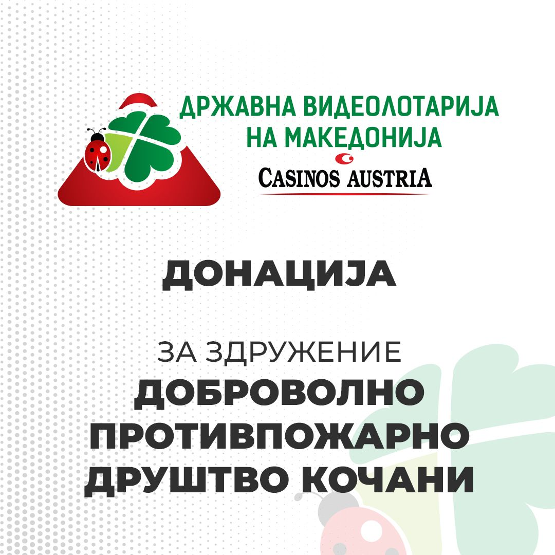Во духот на општествената одговорност и солидарност, Видеолотарија Касинос Австрија уште еднаш обезбеди донација за Здружението Доброволно противпожарно друштво Кочани. Средствата од донацијата во оваа прилика, освен што се значајна поддршка на здружението, ќе придонесат и за надградување и доопремување на претходно набавеното возило со сите неопходните ресурси за гасење пожар.