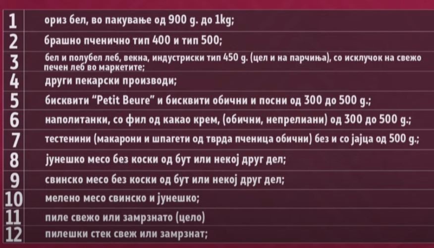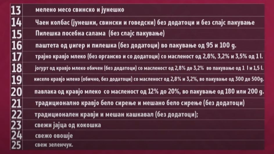 Станува збор за следните производи кои треба да ги намалат своите цени за 10 отсто во однос на цените кои важеле за нив во маркетите на 1 август.