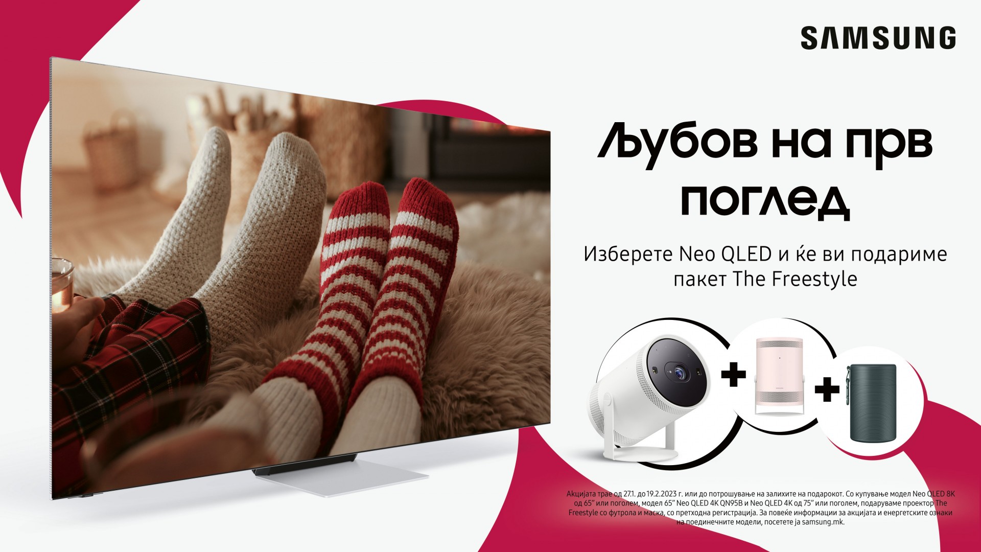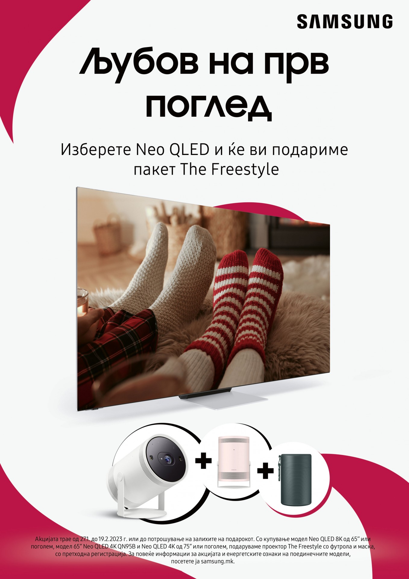 Се ближи месецот на љубовта па токму затоа Samsungпред сите ја слави љубовта. Не само филмовите, туку и игрите се послатки кога се играат во пар, па токму затоа NeoQLEDи TheFreestyleсе нераскинлив пар! Заљубете се на прв поглед со ова неверојатно комбо, изберете NeoQLED, a Samsung ќе ви подари пакет The Freestyle. Акцијата трае од 27.1 до 19.2.2023 година или до потрошување на залихите на подарокот.