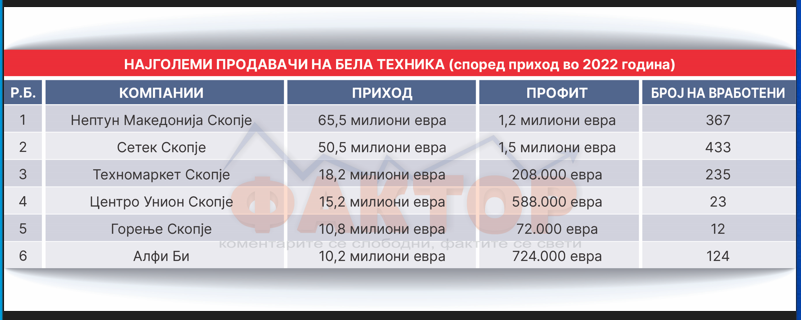 „Нептун“ останува лидер на пазарот од аспект на остварените приходи. Сетек е цврст на втората позиција, а е лидер според остварена добивка. Најефикасен е најмалиот – кумановски Алфи Би затоа што кај оваа компанија како добивка остануваат 7 отсто од приходот од продажба. Приходот кај сите нив е „статус кво“ или речиси ист како претходната година, иако всушност е незначително намален.