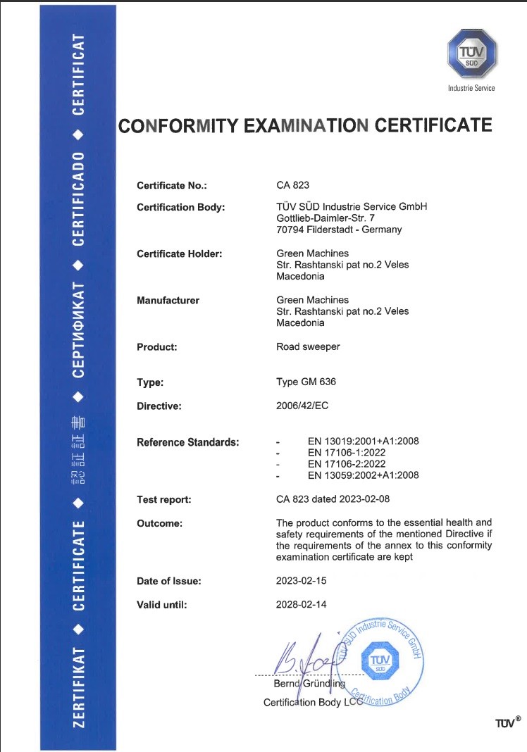 Возилото за урбана хигиена на БРАКО, моделот 636, е сертифицирано за меѓународен квалитет од страна на германскиот институт TUV, ,,TÜV SÜD INDUSTRIE SERVICE GMBH” од Минхен.