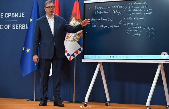 Српскиот претседател Александар Вучиќ на школска табла со креда напиша пет точки кои, според него, се закани за Србија кои се упатени со комеморацијата на геноцидот во Сребреница. Како што додаде, наместо тоа да биде можност за зборови на помирување и почит кон жртвите, граѓаните на Србија, српскиот народ и Република Српска беа изложени на навреди и на најдиректни закани.